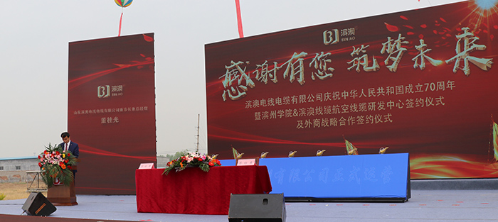 在參觀完車間后各位領(lǐng)導(dǎo)同志和來賓在董總引領(lǐng)下步入慶典簽約儀式主會場。慶典簽約儀式在上午9點30分正式開始。慶典簽約儀式由濱州工業(yè)園區(qū)管委會主任李建漢同志主持。首先是濱澳線纜創(chuàng)始人、董事長兼總經(jīng)理董桂光先生致歡迎詞,他在講話中首先感謝了各位領(lǐng)導(dǎo)、各位親朋好友、經(jīng)銷商、客戶、友商以及來自社會各方面的朋友在幫忙之中抽出時間來參加此次活動。他回顧了濱澳十年艱苦奮斗的發(fā)展史,感謝社會各界對濱澳線纜長期以來的支持和濱澳員工的默默奉獻,并展望未來十年濱澳在新的起點上努力取得更大的成就。